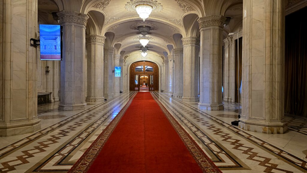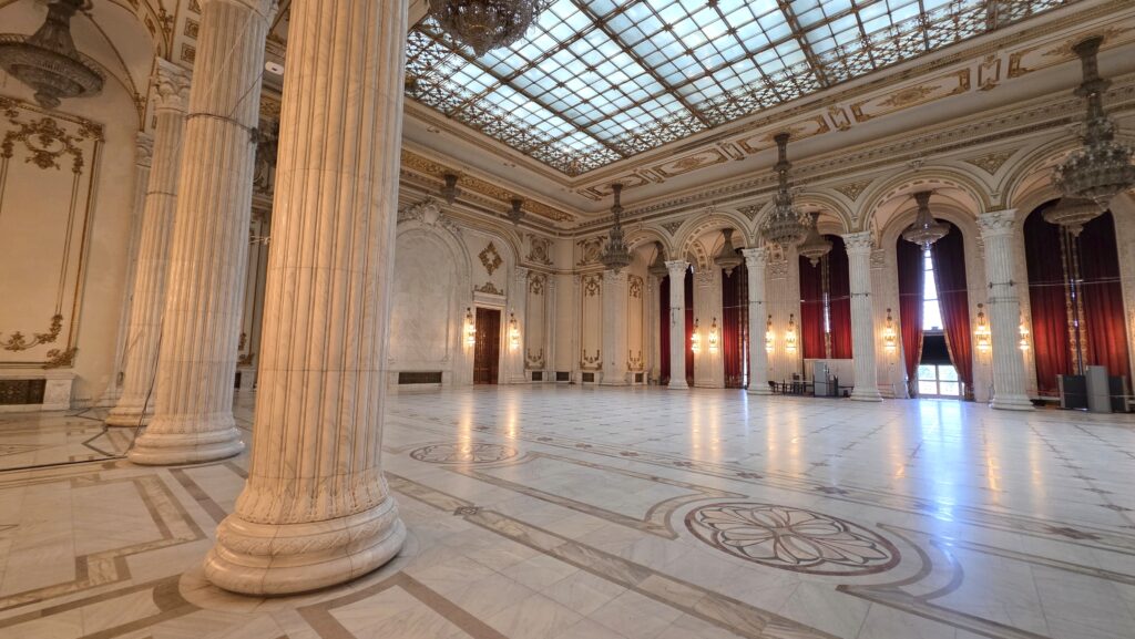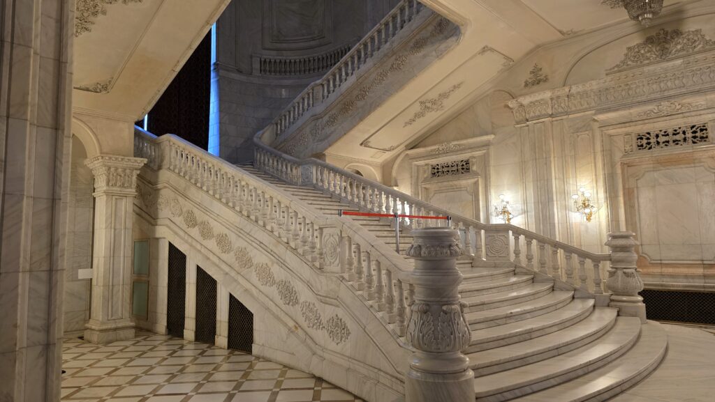 Marmurowa klatka schodowa – prowadzi do trzech reprezentacyjnych salonów, z których każdy kolejny jest większy od poprzedniego. Schody zostały zaprojektowane specjalnie pod rytm kroków Ceaușescu.